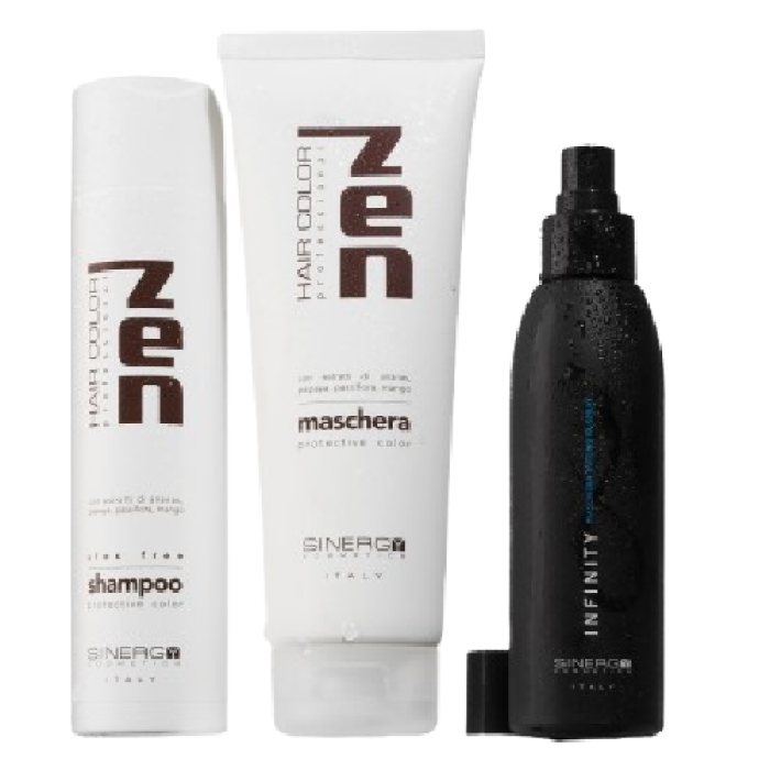 Опис Набір ZEN Sinergy шампунь, маска та спрей 10в1 з кератином Infinity для фарбованого волосся, 250/250/150 мл
