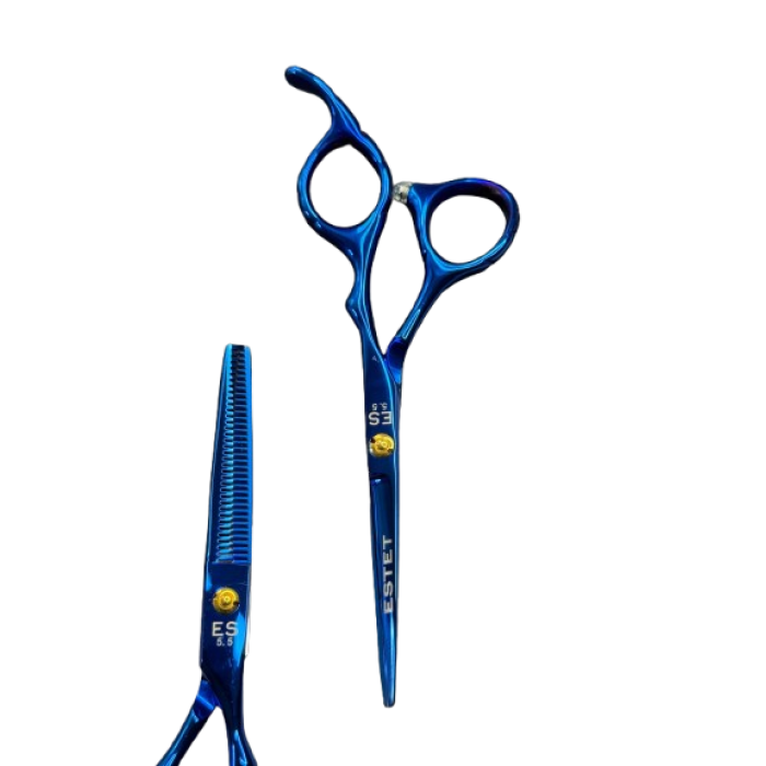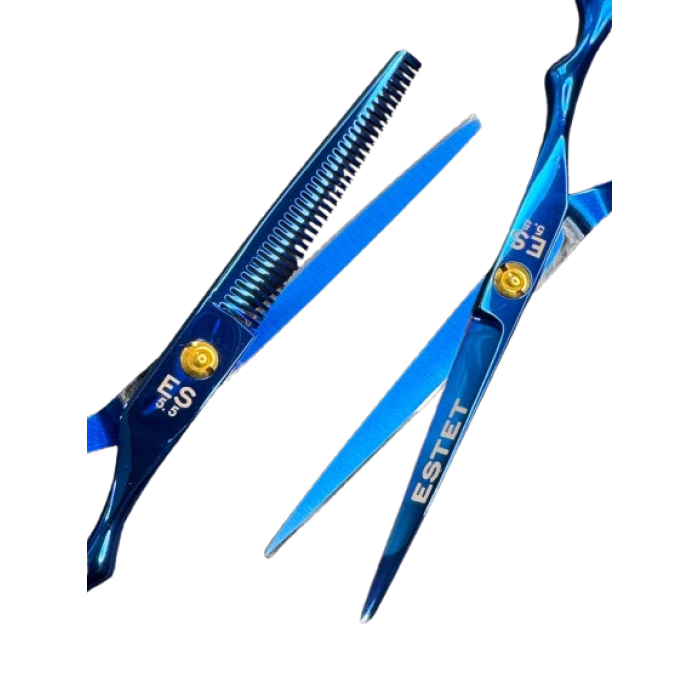 Ножницы парикмахерские Estet синие — надежный и качественный инструмент для профессиональных парикмахеров и домашнего ухода за волосами. Изготовлены из высококачественной нержавеющей стали с точной заточкой, обеспечивают ровный и аккуратный срез без повреждения волос.
